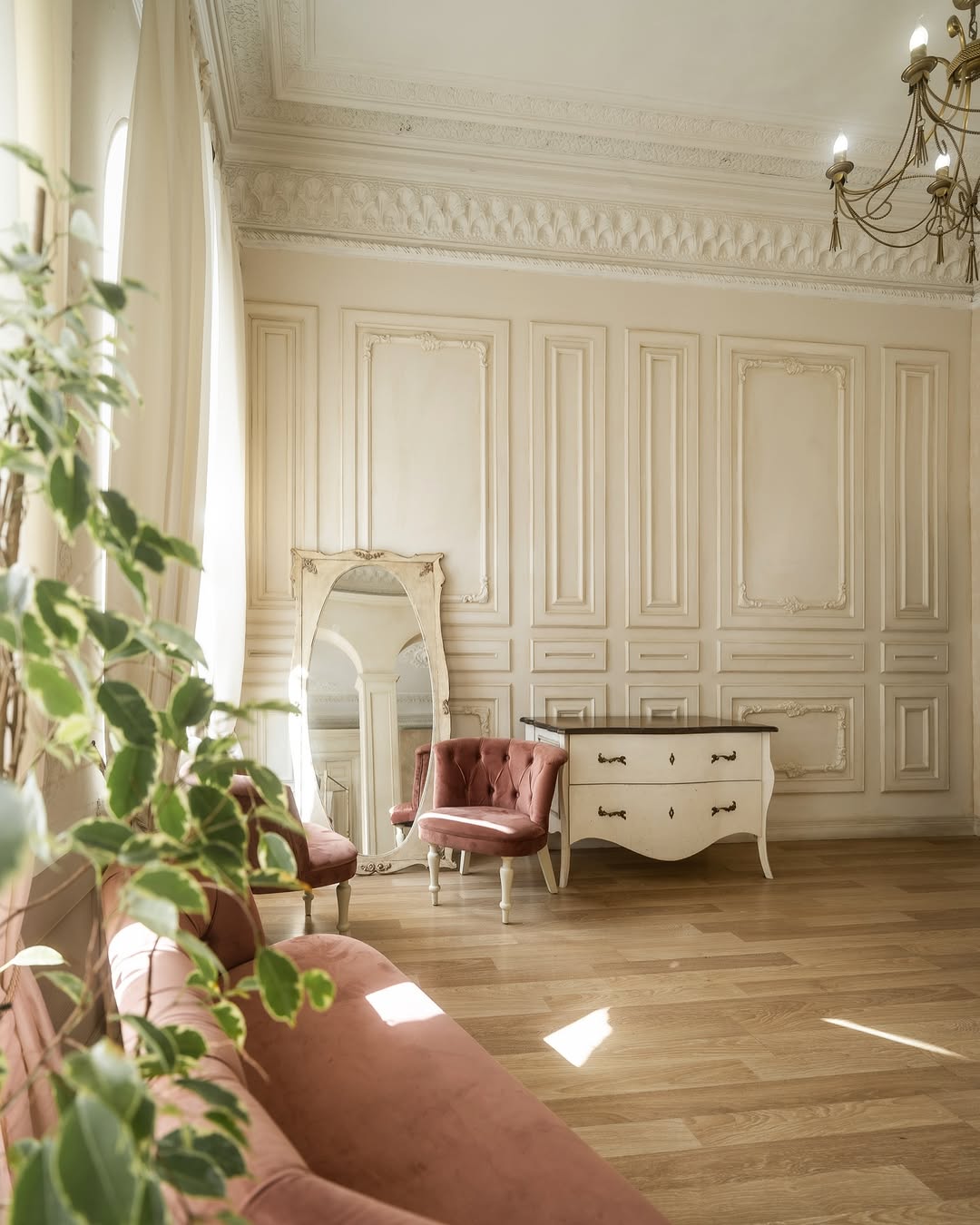 Зал подходит для различных фотосессий: романтических Love Story на французской террасе, семейных и портретных съемок в светлых зонах с элегантной мебелью, fashion-фотосессий с зеркалами в золотых рамах и бархатной мебелью, коммерческих съемок для брендов, а также креативных проектов с игрой света и тени благодаря минималистическому декору.